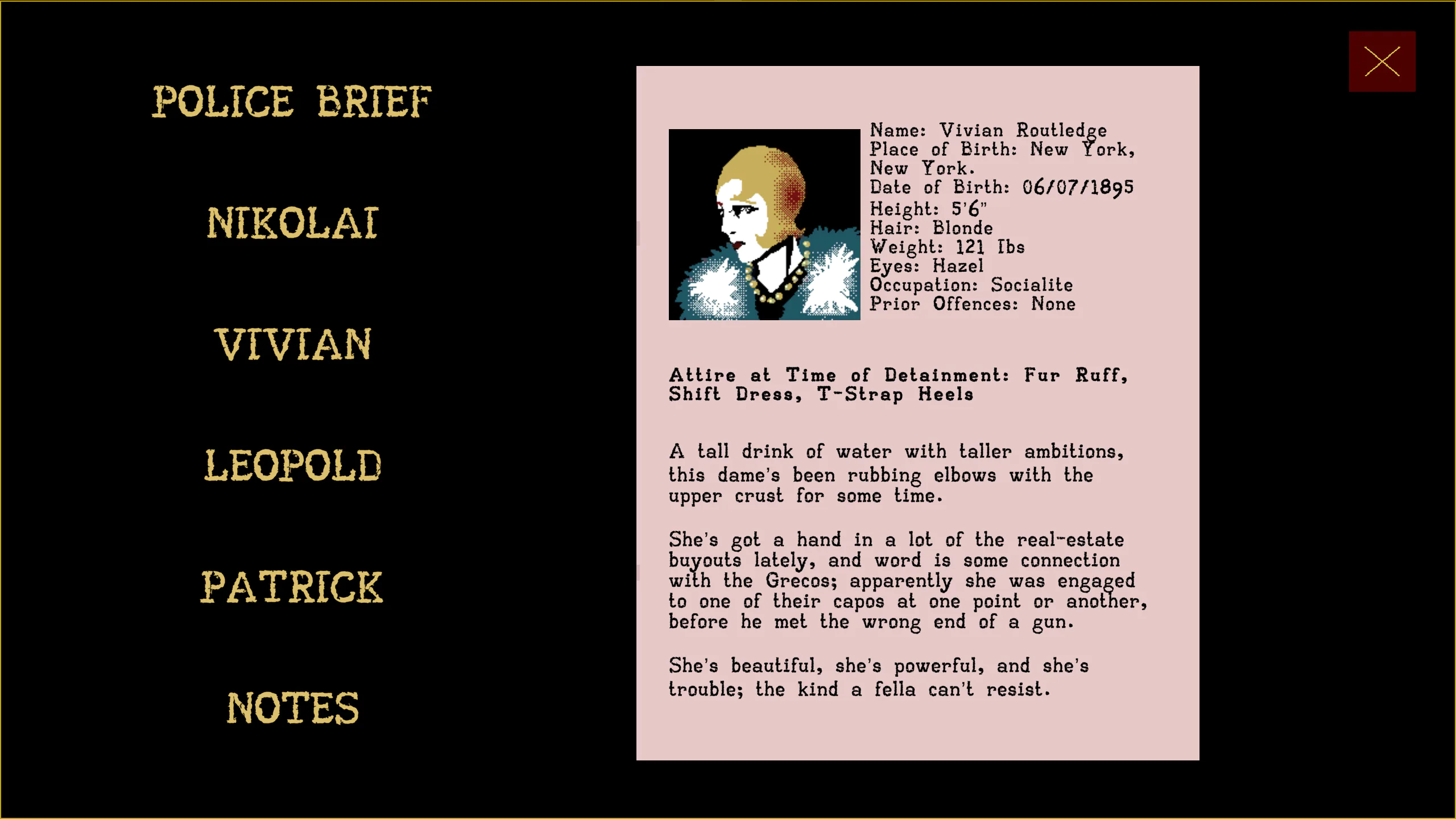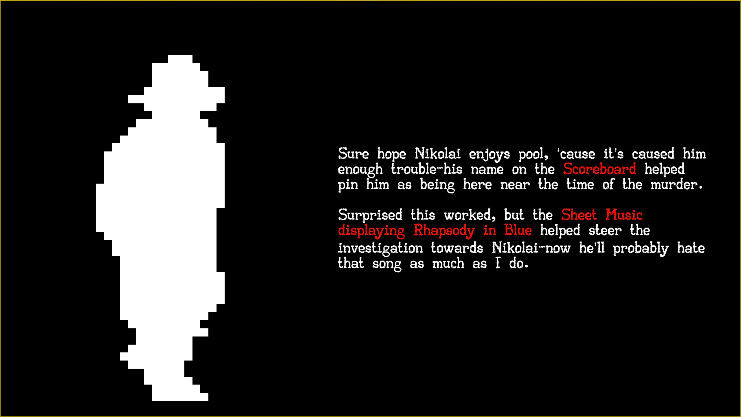 Designing evidence pieces, working with the narrative designer to create narrative hooks for each evidence piece, and balancing their links to each suspect to allow for multiple endings.