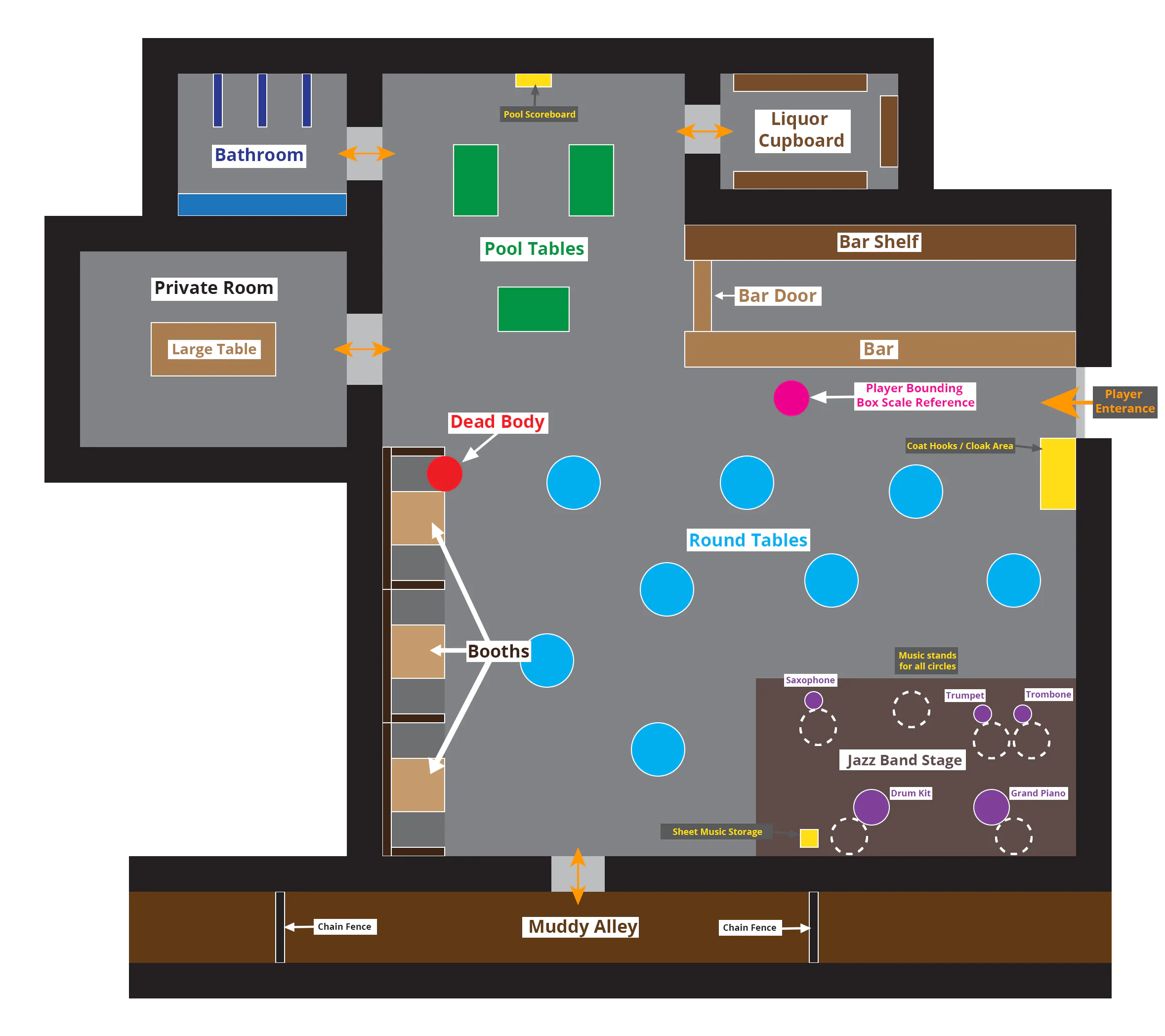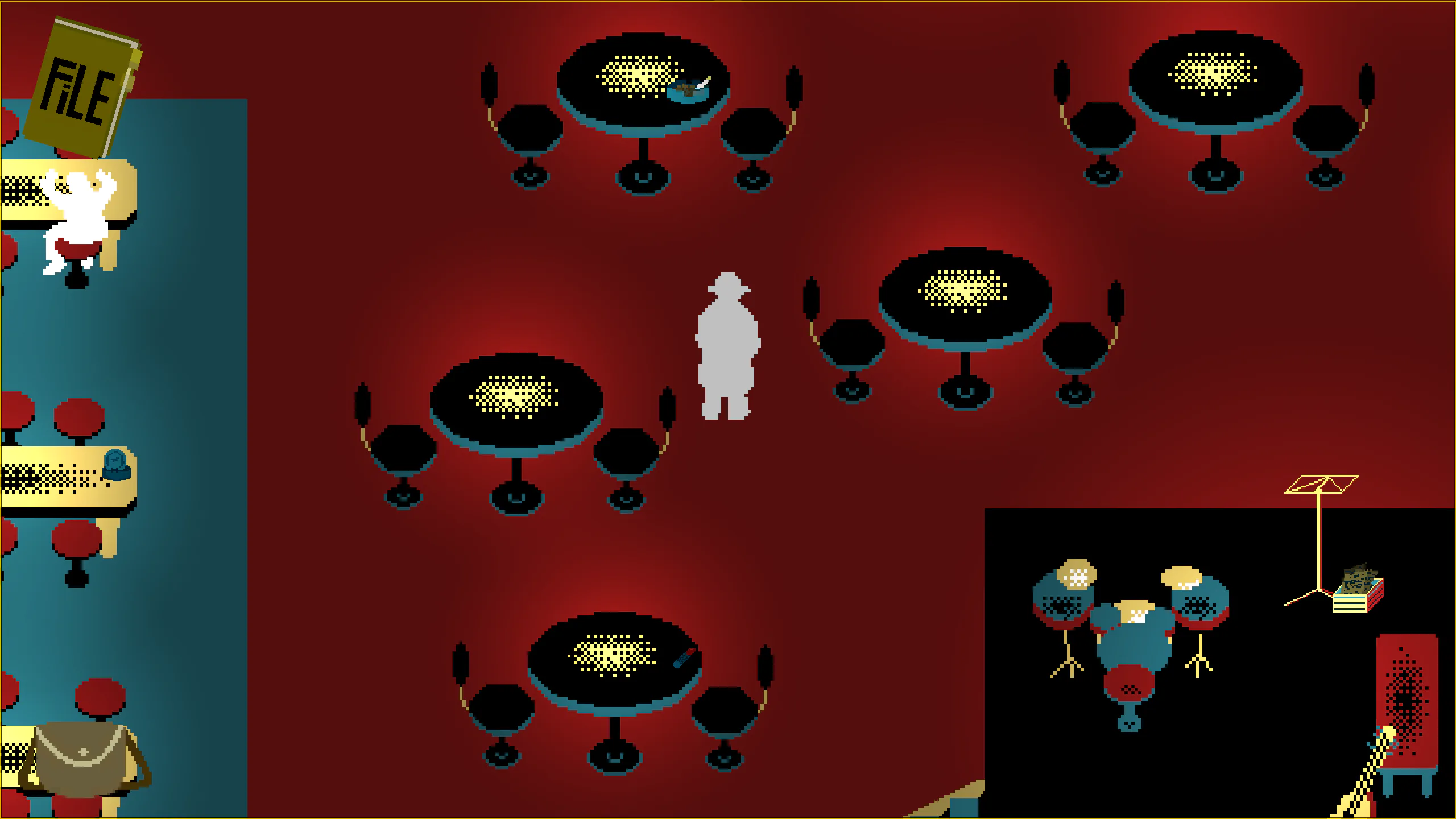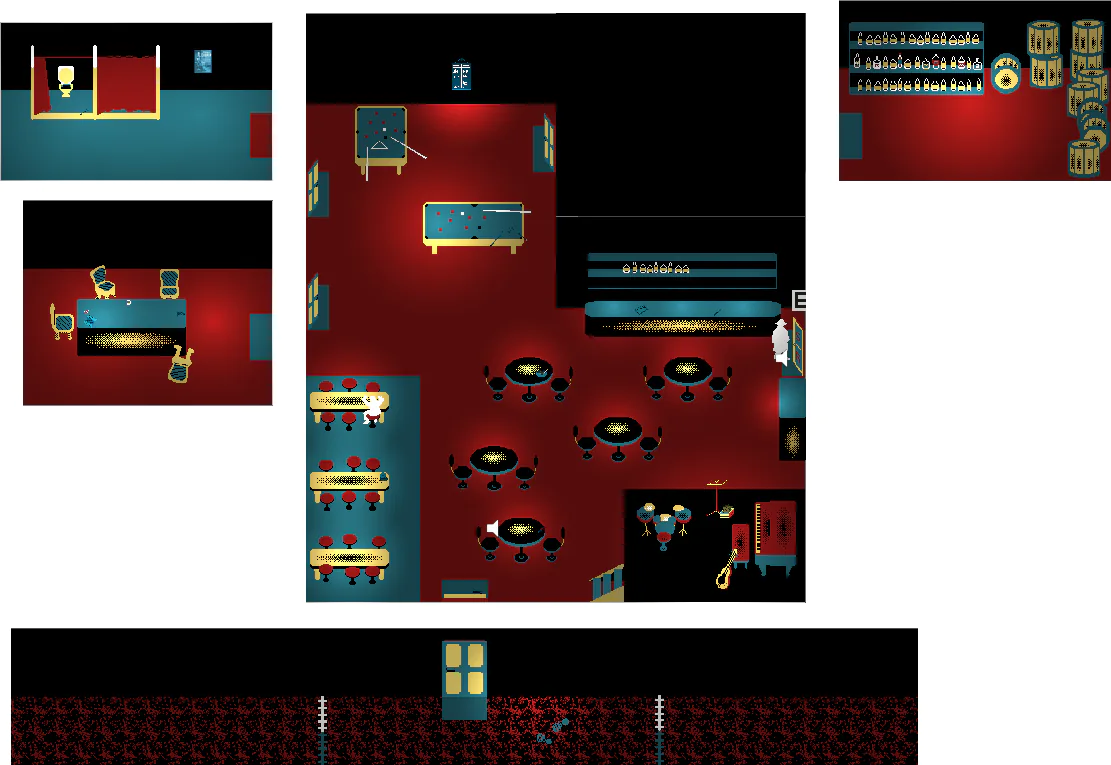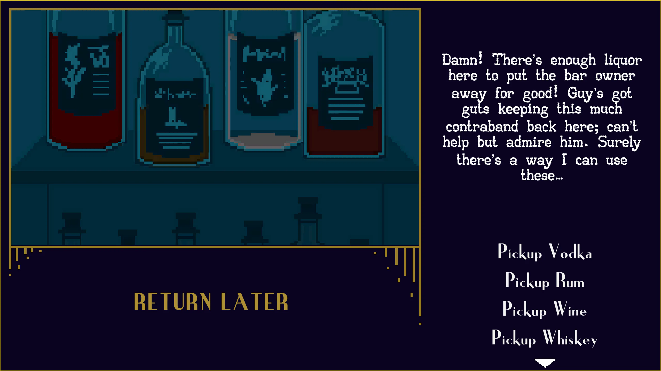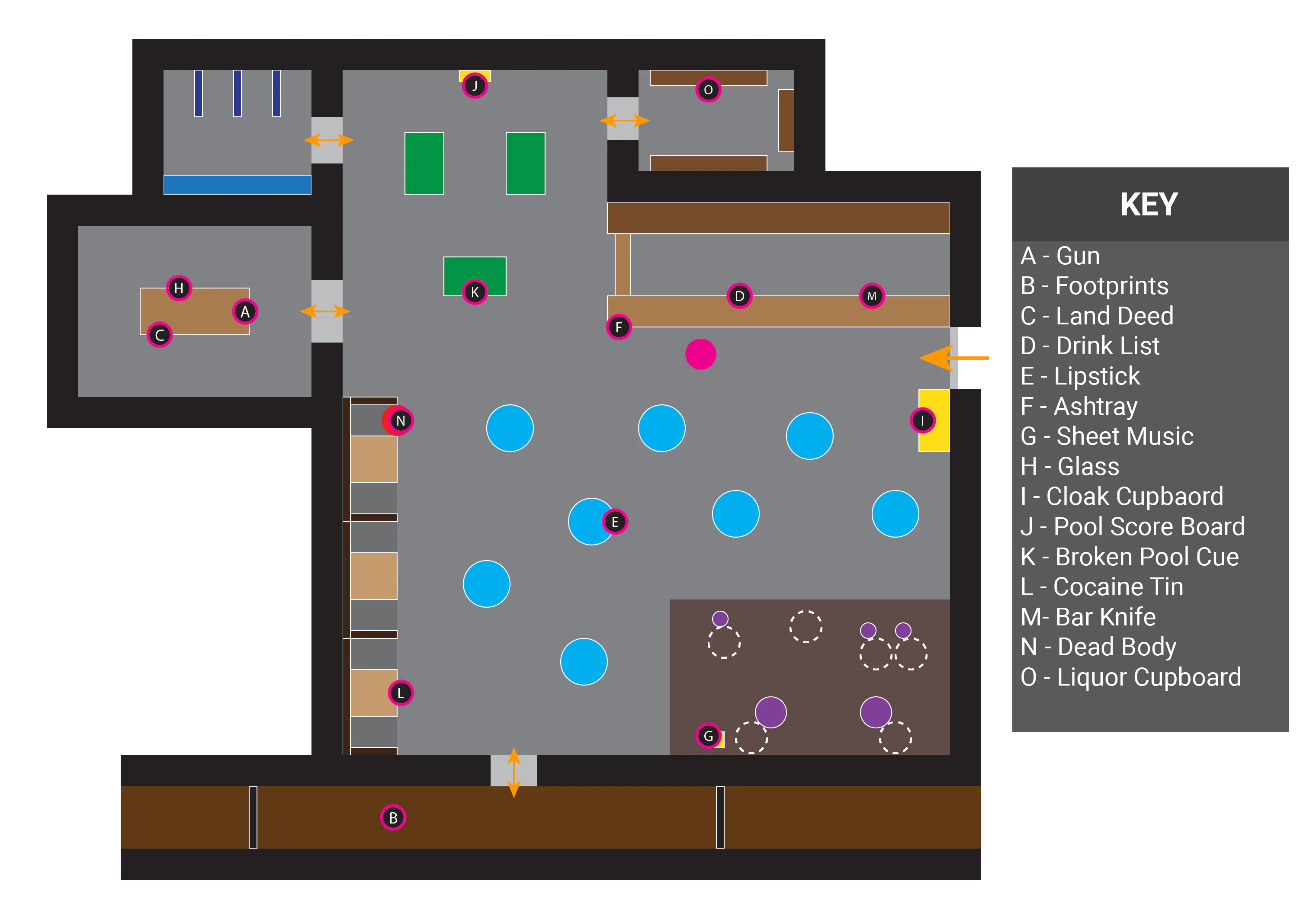 Crime Or Punishment uses a simple hub layout for the Sweet Rine speakeasy, its primary level. The player begins in the main bar of the speakeasy, but can freely explore to discover three other immediately accessible ‘rooms’: the alleyway, the private room and the bathroom. Each room, including the main bar, contains evidence pieces that can be picked up or altered to implicate a certain suspect. Some evidence pieces can be completed within one room, but others can span across multiple, such as acquiring the cocaine in the bar and taking it to the private room to tamper with the land deed. A final room, the liquor cupboard, can only be accessed by unlocking its door with a key left in the bathroom. Once the player is satisfied with their tampering, they can exit out the speakeasy’s mian door to receive their custom ending.